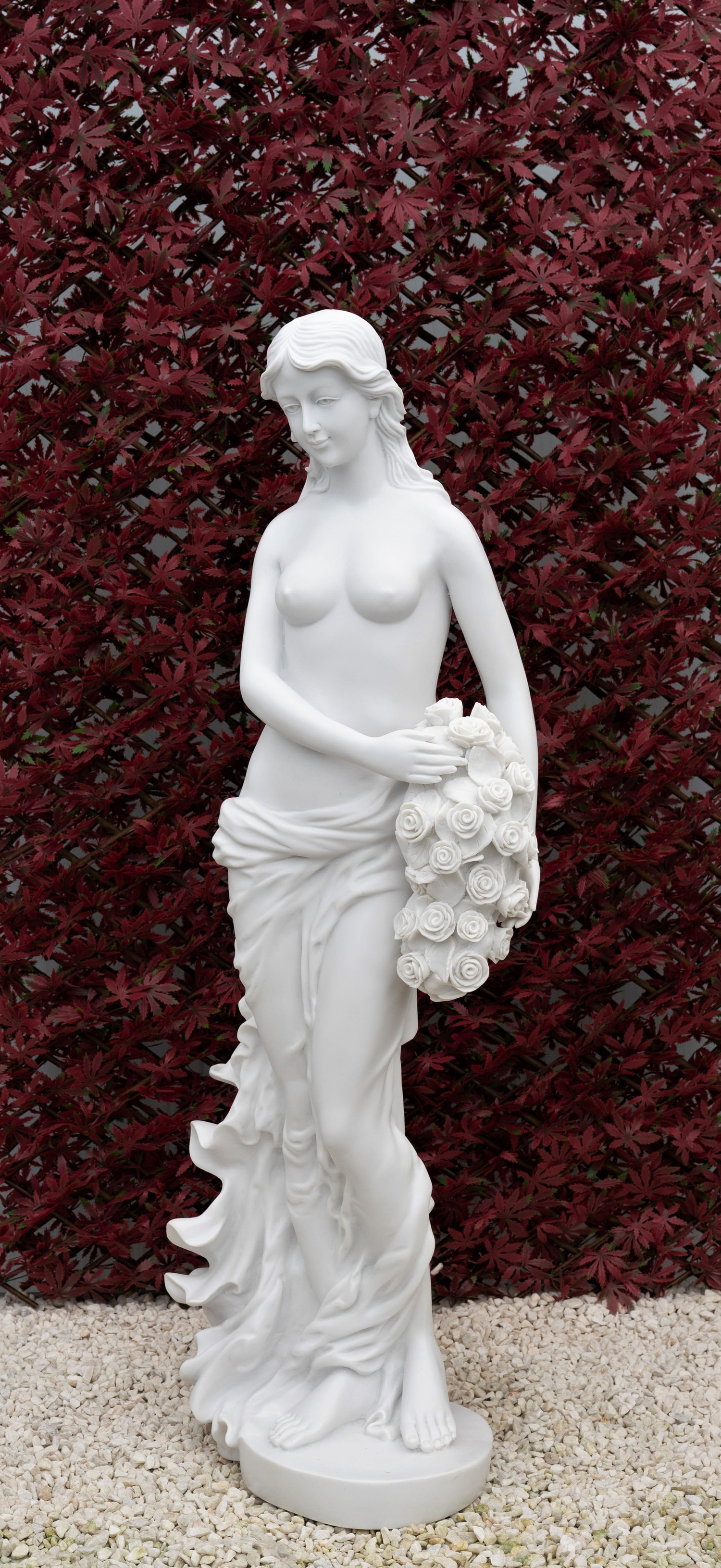 Capture the essence of classical beauty with this exquisite study of grace and nature. Inspired by the traditions of ancient Greek marble sculpture, this piece depicts a young woman in uninhibited motion, her flowing robes swirling around her as she cradles a delicate bouquet of roses. This high-definition reproduction is crafted from a specialised terrazzo marble and resin composite, ensuring the statue remains impervious to frost and harsh weather while retaining a smooth, alabaster-like sheen. Whether selected as a grand centrepiece or a subtle accent in a smaller courtyard, this durable piece brings an atmosphere of serenity and historical elegance to patios, balconies, and formal gardens alike.