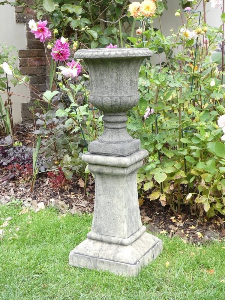 Cast from reconstituted stone, the Keymer Pedestal arrives with a pre-aged surface finish. Moss and lichen attach naturally within the first season. The result is a pedestal that looks like it has stood in place for decades.