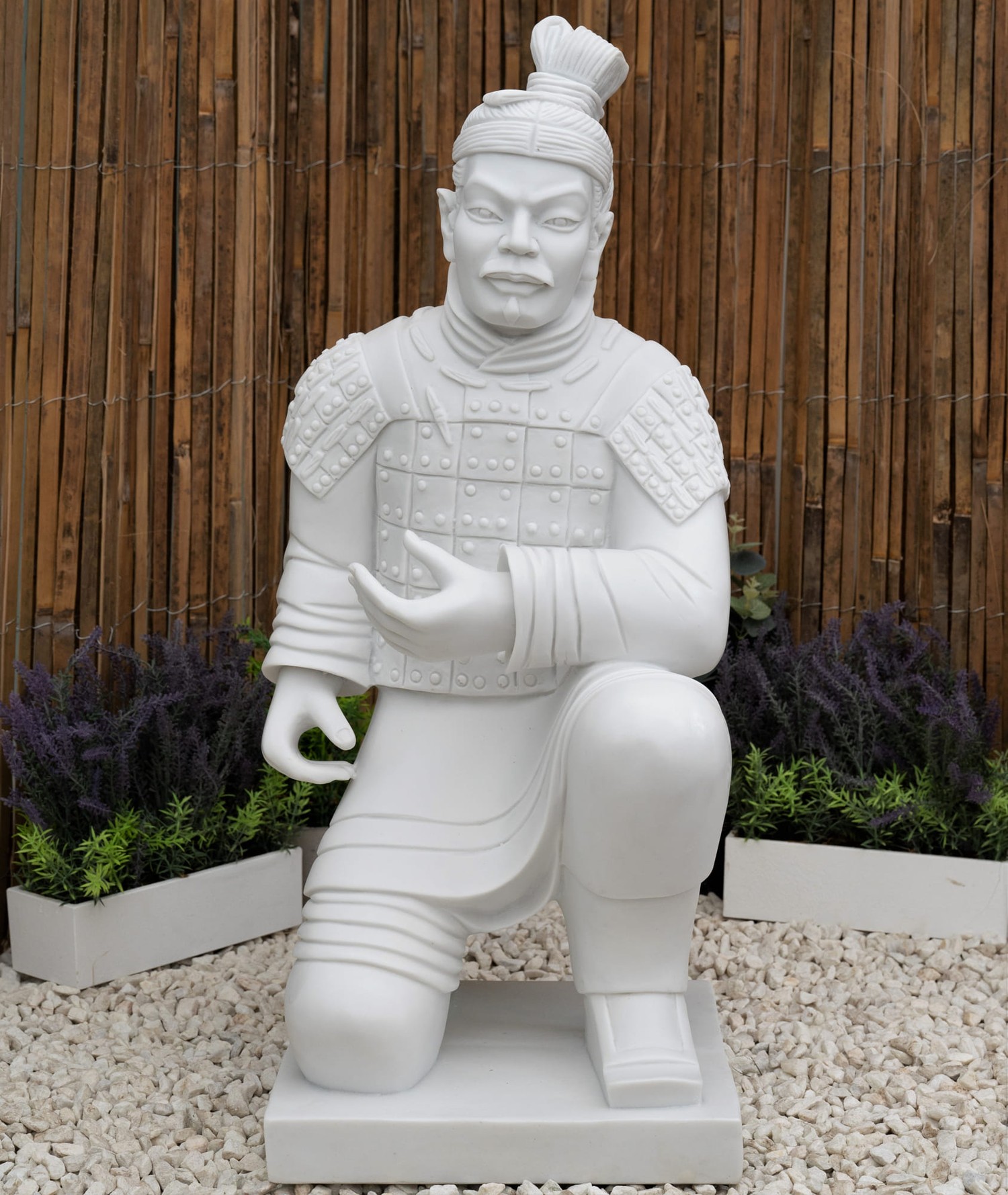 Inspired by the legendary Terracotta Army warriors of ancient China, this kneeling figure faithfully reflects the detailed armour, disciplined posture, and steely expression of the original sculptures. Crafted from premium white terrazzo marble, this Kneeling Warrior Garden Ornament is a refined reproduction that captures the artistâs original vision with beautifully crisp detail and lasting durability. Suitable for year-round indoor or outdoor display, the Kneeling Warrior statue adds a sense of strength, heritage, and character to any setting.