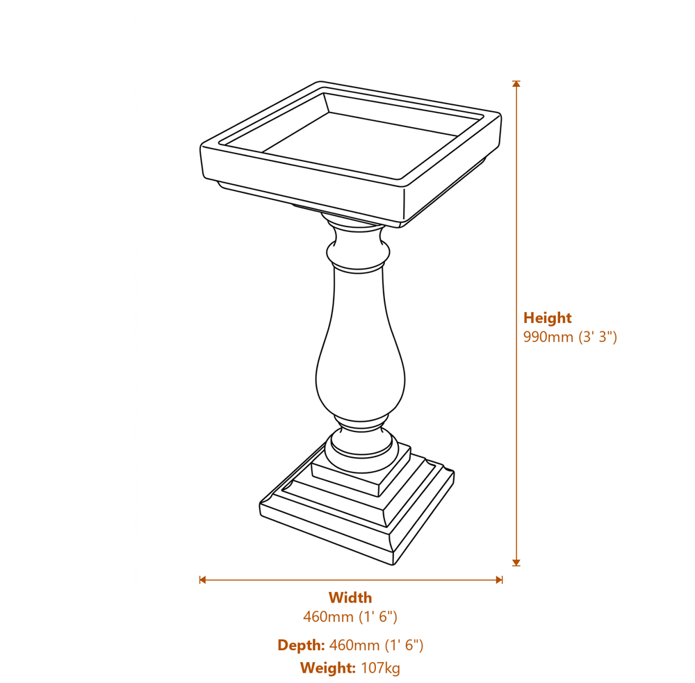 Handcrafted 990mm cast stone birdbath with ornate baluster column in Aged Cotswold or Burnt Umber