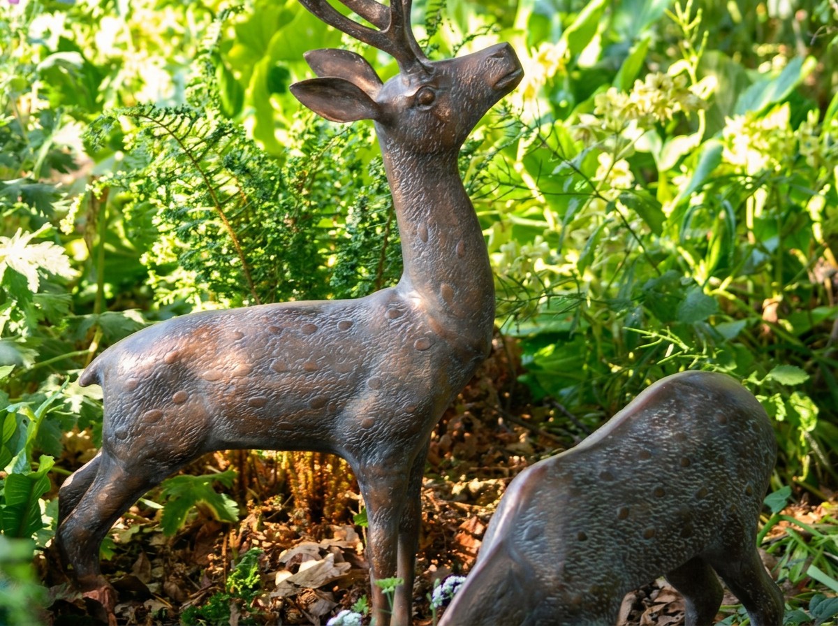 Place the pair among shrubs, ferns, or at the edge of a woodland border for the most natural effect. The verde bronze finish catches dappled sunlight and develops character over time.