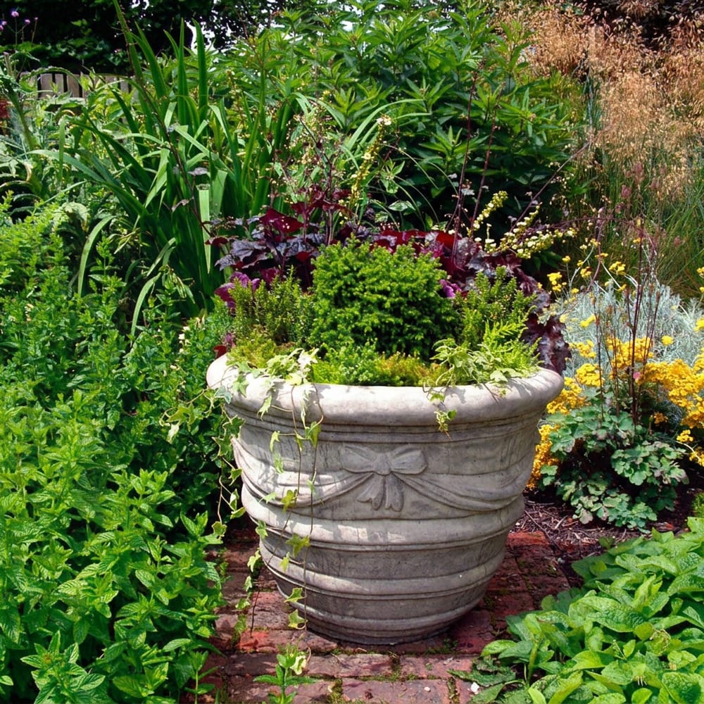 Handcrafted cast stone garden vase with draped detailing, available in Aged Cotswold or Burnt Umber