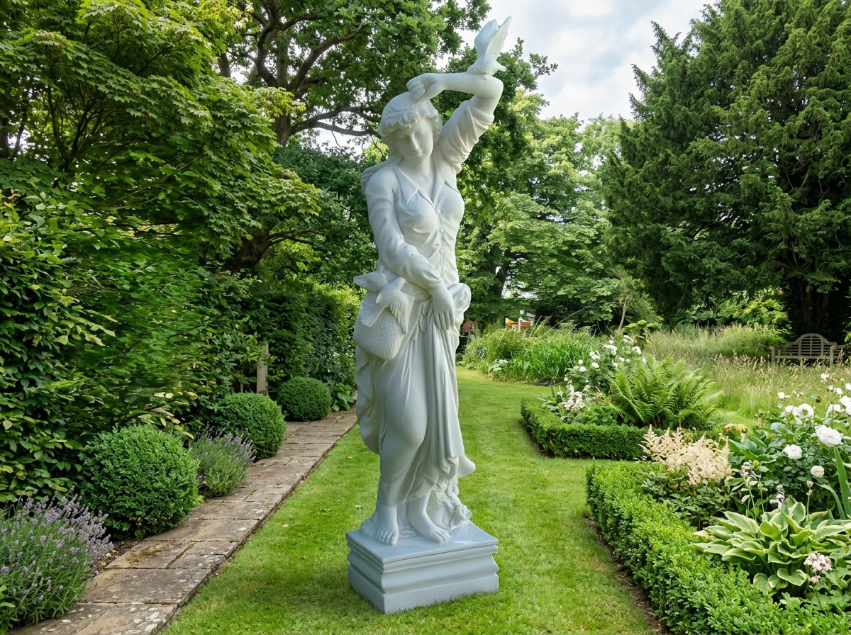 Each statue is hand-cast from a blend of crushed marble and resin. The result is a silk-smooth, pure white surface that captures the look of genuine Italian alabaster. Fine details â including the bird perched on Melanie's raised hand â are refined by skilled artisans. No two pieces are identical.