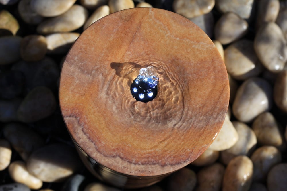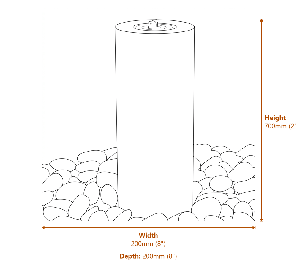 Water flows over the top of the column and cascades down the stone surface into a hidden reservoir beneath. The 670mm diameter steel grid cover sits at ground level, keeping the mechanism out of sight. The recirculating pump means no mains water connection is needed. Fill the reservoir, plug in the pump, and water flows within minutes.