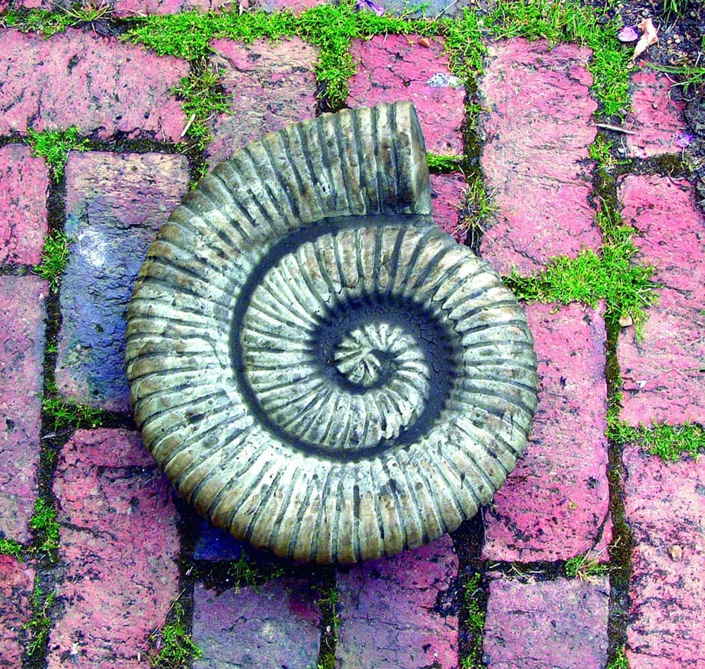 Handcrafted cast stone ammonite fossil statue in Aged Cotswold or Burnt Umber, 34cm tall and weighing 14kg