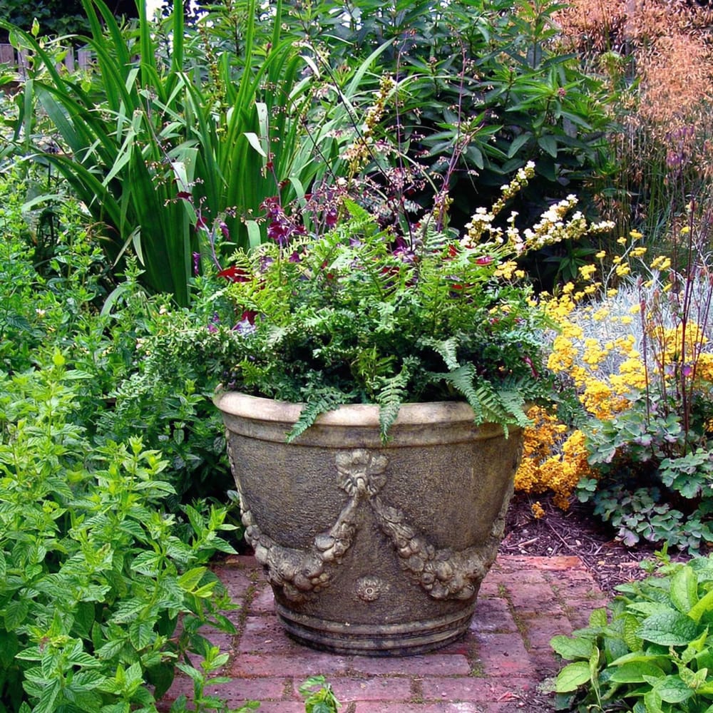Handcrafted 54cm cast stone garden vase with embossed swag motif in Aged Cotswold or Burnt Umber