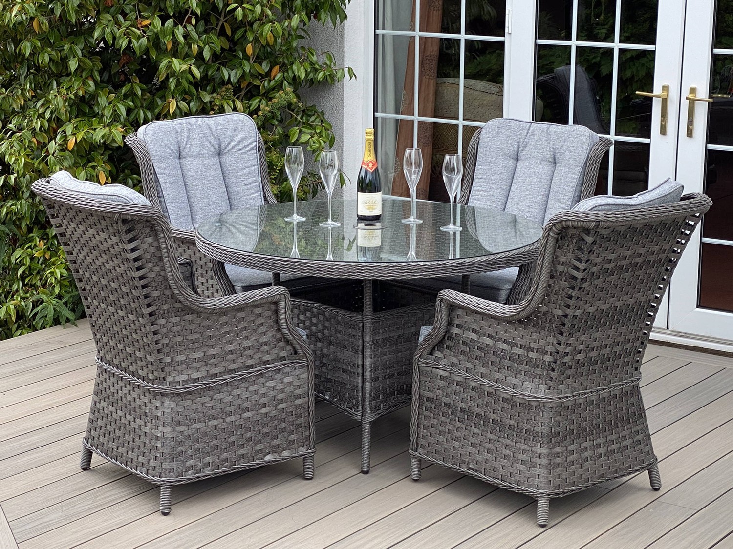 The 4 Seat Lichfield Campania Rattan Dining Set come in a dark grey weave, which is comfortable, durable and easily maintained. The tables come with a tough 5mm tempered glass tabletop and the whole Campania range comes with a 5 year UV guarantee.
