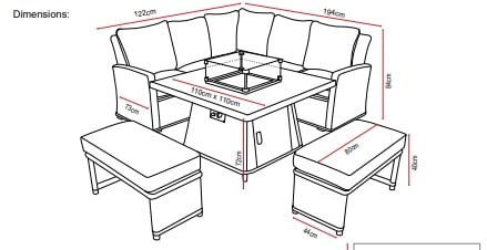 - Fire Pit Table Size: 150cm L x 90cm D x 50/68cm H