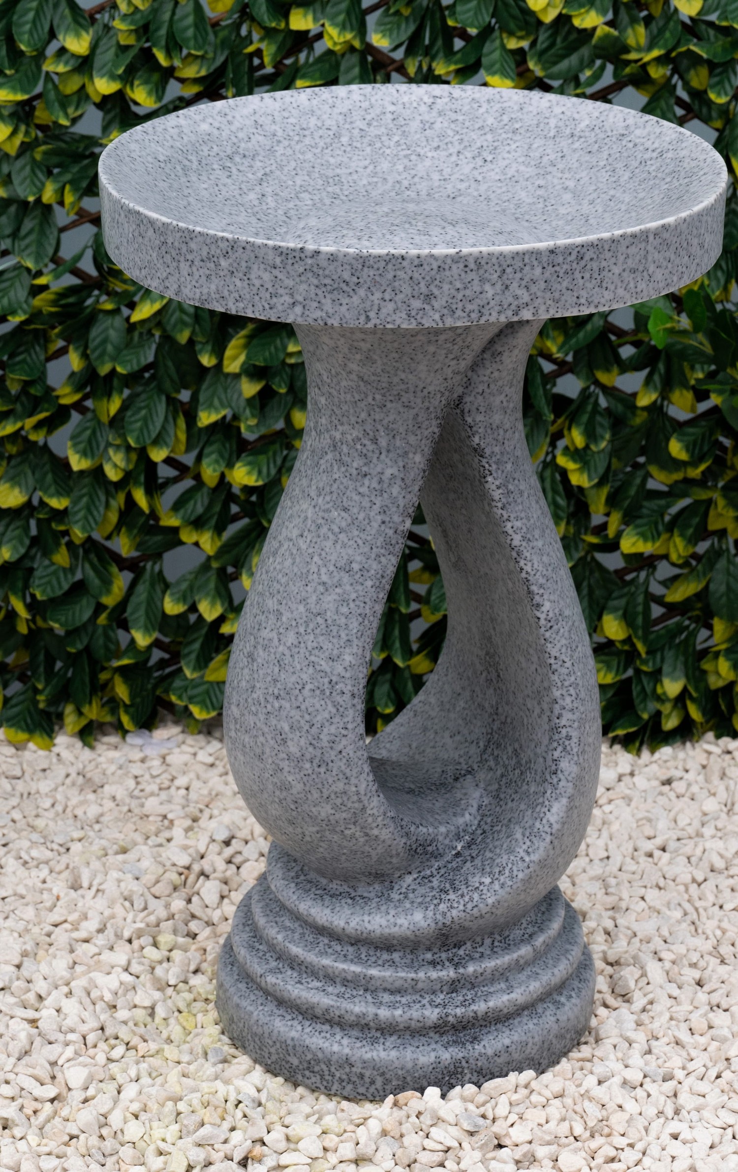 Defined by its smooth circular bowl and flowing looping base, this birdbath introduces a sense of movement and elegance to your outdoor space. Its contemporary form enhances the surrounding garden while providing a welcoming place for birds to drink and bathe, helping to bring life and activity into your landscape. Crafted from premium grey terrazzo marble, this high-quality piece showcases crisp detailing, excellent stability, and long-lasting durability. Suitable for year-round outdoor display, the Grey Looping Stone Birdbath is a stylish and functional focal point for gardens, patios, or balconies.