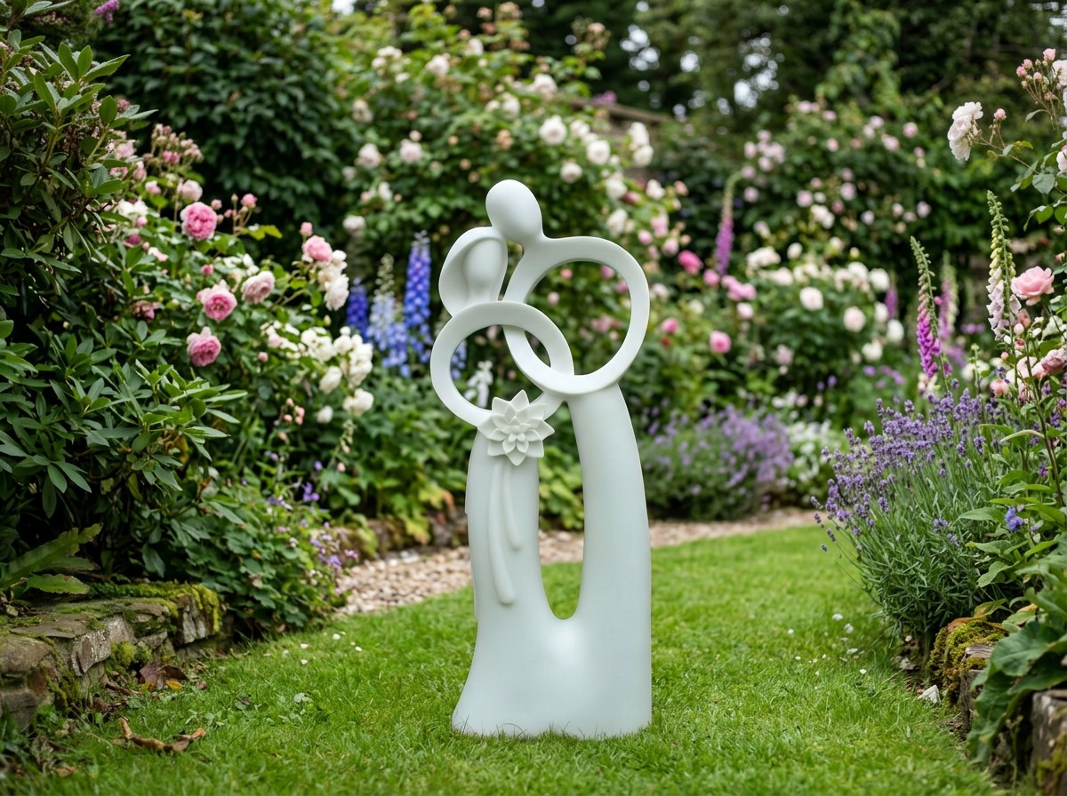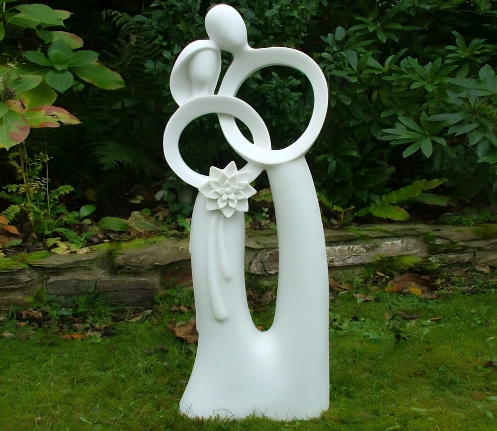 The design features two interlocking figures with a delicate floral centre. It works equally well on a patio, beside a pond, or as an indoor display piece. The flat base sits securely on any level surface without fixings.