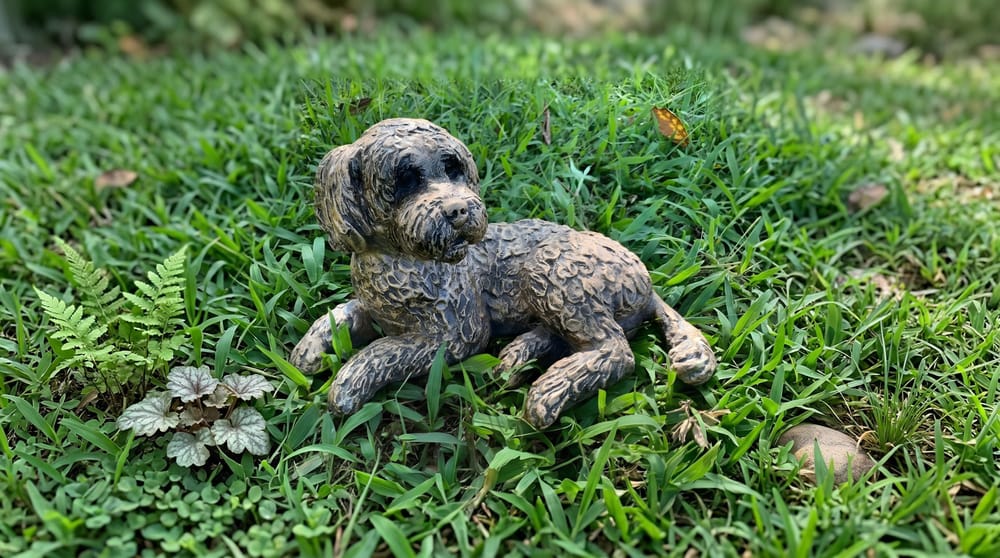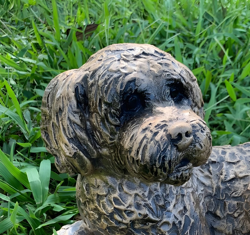 Hand-finished bronze cockapoo garden ornament in crushed marble and resin, frost-resistant for year-round outdoor display