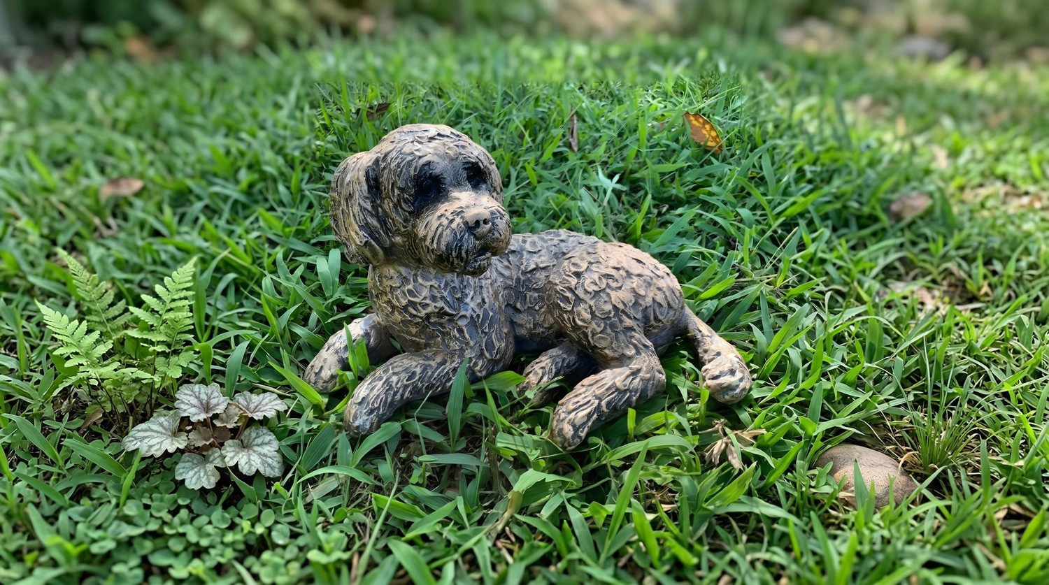 This lying Cockapoo garden ornament captures the relaxed charm of the breed in a hand-finished bronze-effect statue. Standing 25cm tall and 36cm deep, it makes a striking centrepiece for borders, patios, or conservatories. Order today for just £169 with free UK delivery.