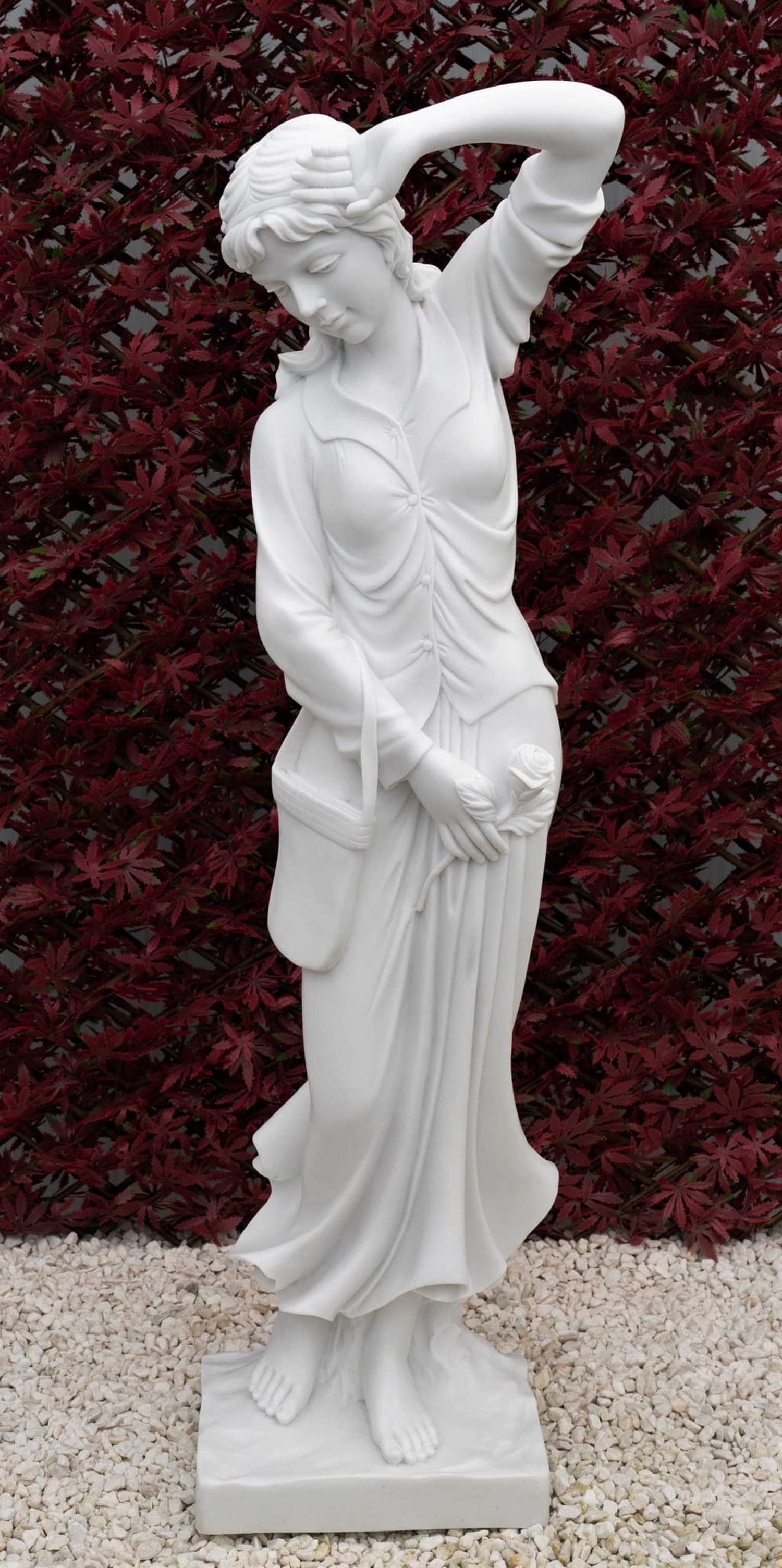 Based on a 19th century Italian Renaissance marble statue, this beautifully detailed Madelaine Garden Statue depicts a shy young woman holding a purse bag and rose, with her arm gently raised in a graceful pose. Handcrafted from pure white terrazzo marble using crushed marble and resin, the Madelaine statue features a smooth alabaster finish and exceptional crisp detail. Durable, frost-proof, and easy to maintain, it is available in two sizes and perfectly suited to formal and cottage gardens, patios, balconies, terraces, or sophisticated interior spaces.