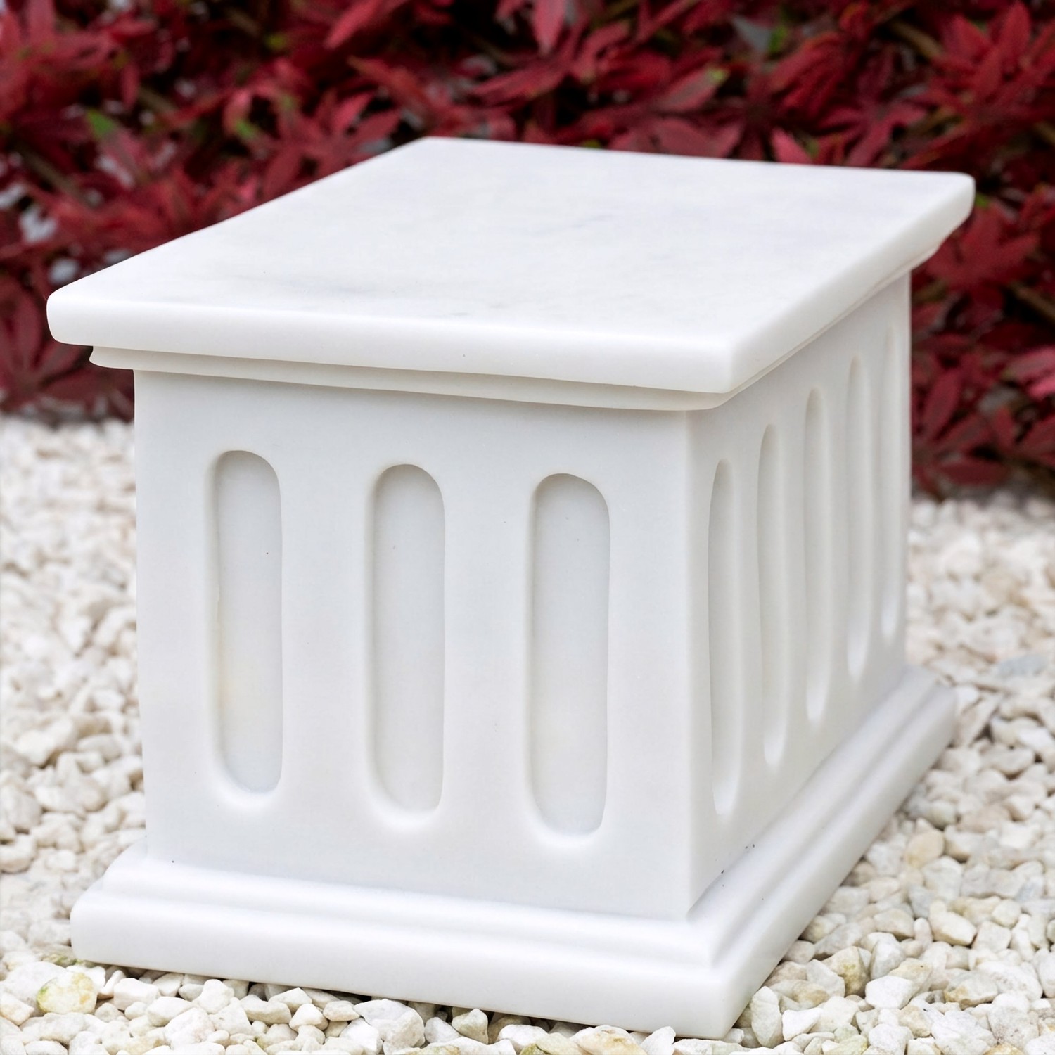 Cast from crushed marble blended with architectural-grade resin, this plinth resists frost, rain, and UV exposure. The surface stays bright white season after season with minimal upkeep. A quick wipe with soapy water is all it needs to look fresh.