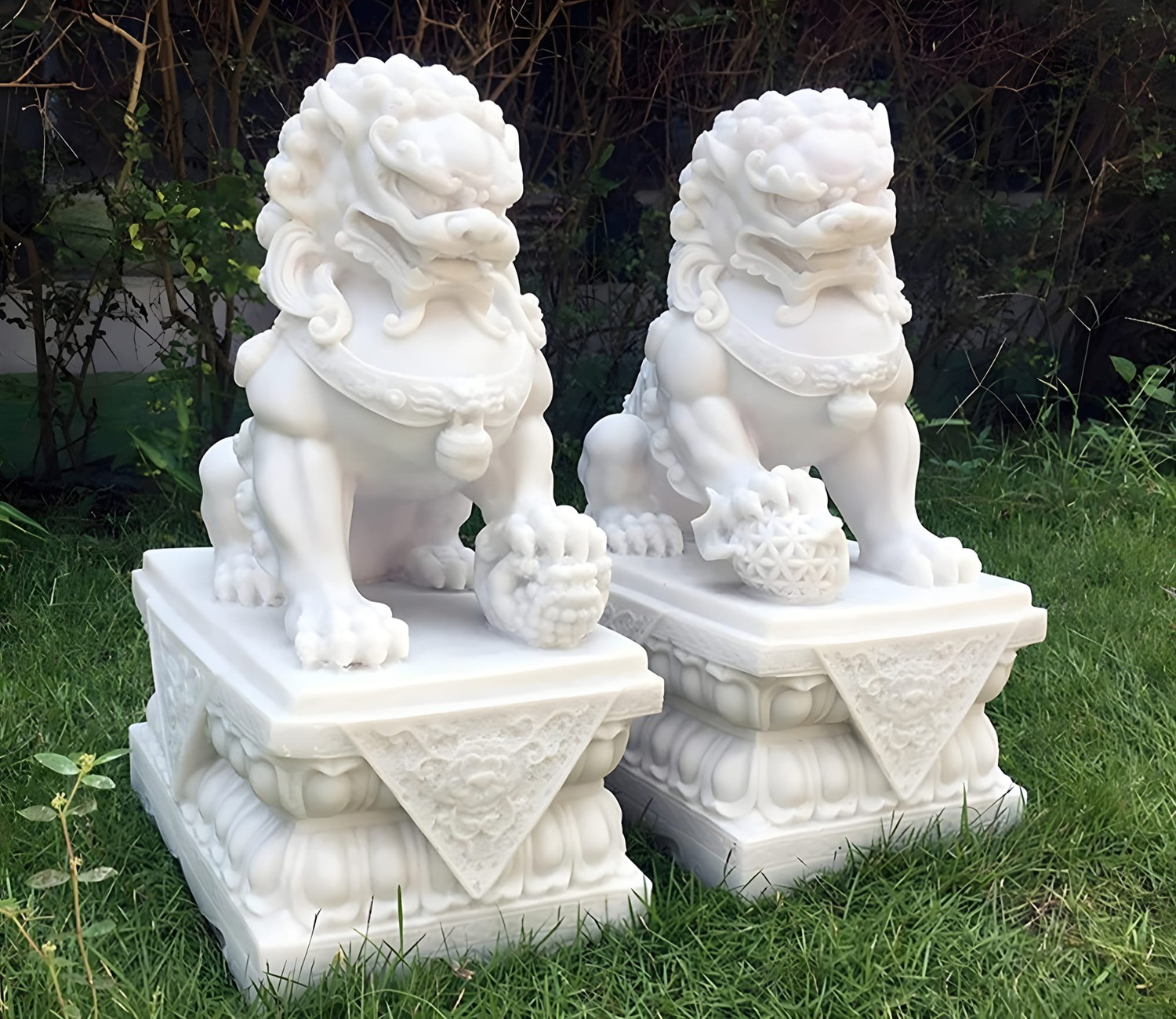 Expertly hand worked to meet the highest standards of quality, this pair of Medium Temple Dogs Garden Statues in White are cast from a specialised marble-resin blend that mimics the substantial weight and luxurious cooling touch of fine Italian stone. Each statue features a stoic, muscular form and a detailed mane, as seen in the provided imagery, supported by a sturdy decorative base that allows for secure positioning on any level paving or patio surface. Engineered for permanence and ease of care, the frost-resistant finish ensures these guardians retain their pristine alabaster appearance through the rigours of the British climate.