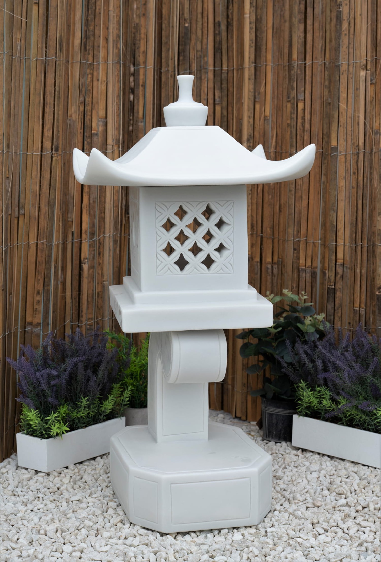 The White Modern Pagoda Garden Statue is a refined and atmospheric feature, designed to create a striking focal point in gardens, patios, or interior spaces.