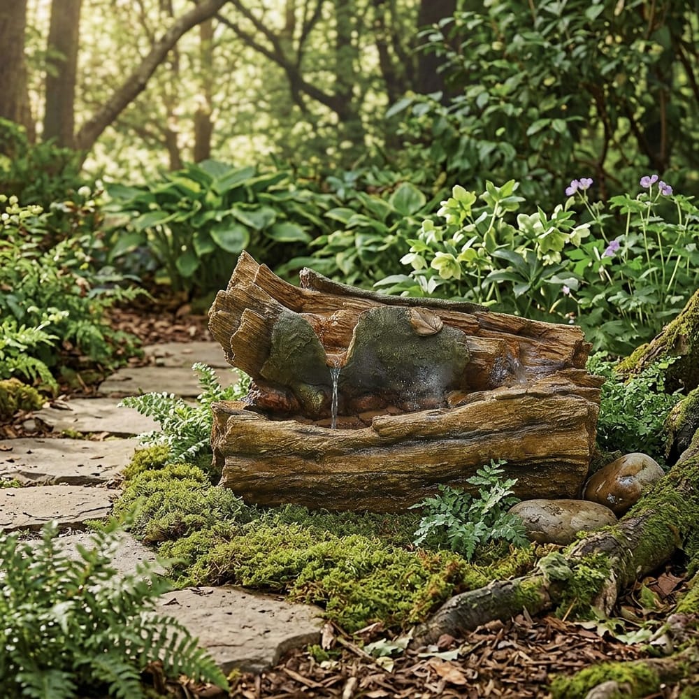 The Natural Logs water feature recreates a cluster of woodland logs with realistic peeling bark, fallen leaves, and gentle water pools. Priced at £225, it brings a natural focal point to any garden setting.