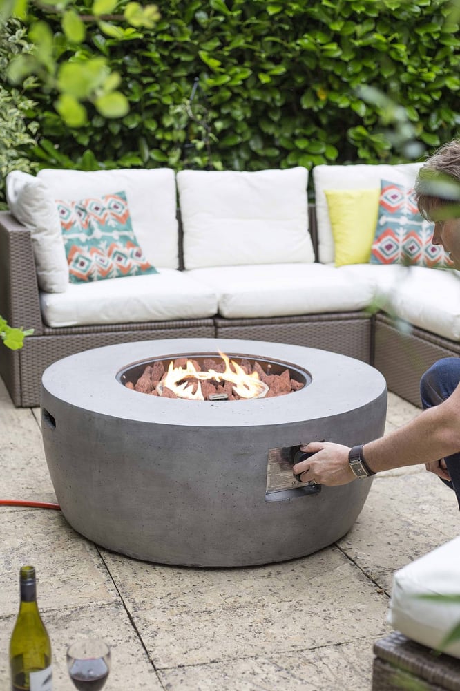 The Concrete Effect Orlando Gas Garden Firepit is made from Glass Fibre Magnesia Constuction for a contemporary looking yet long lasting finish. Simple self assembly means you will be heating your garden in no time!!