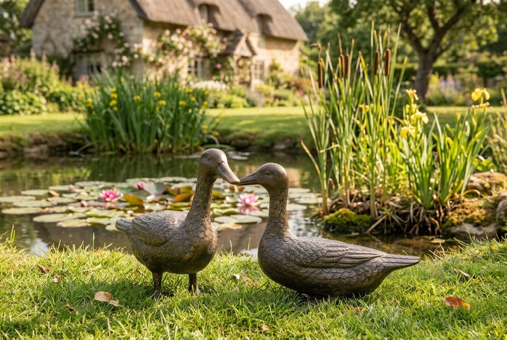 Cast aluminium duck pair with hand-finished aged bronze patina for year-round garden display