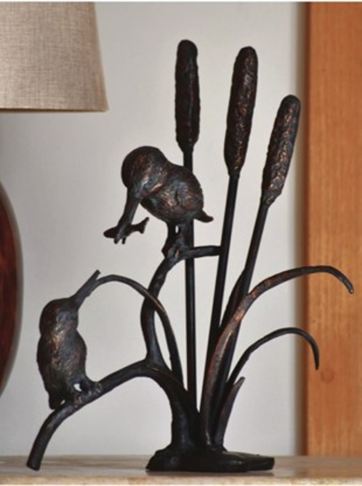 A hand-finished aluminium kingfisher pair with bronzed verde patina, standing 390mm tall among detailed bullrushes.