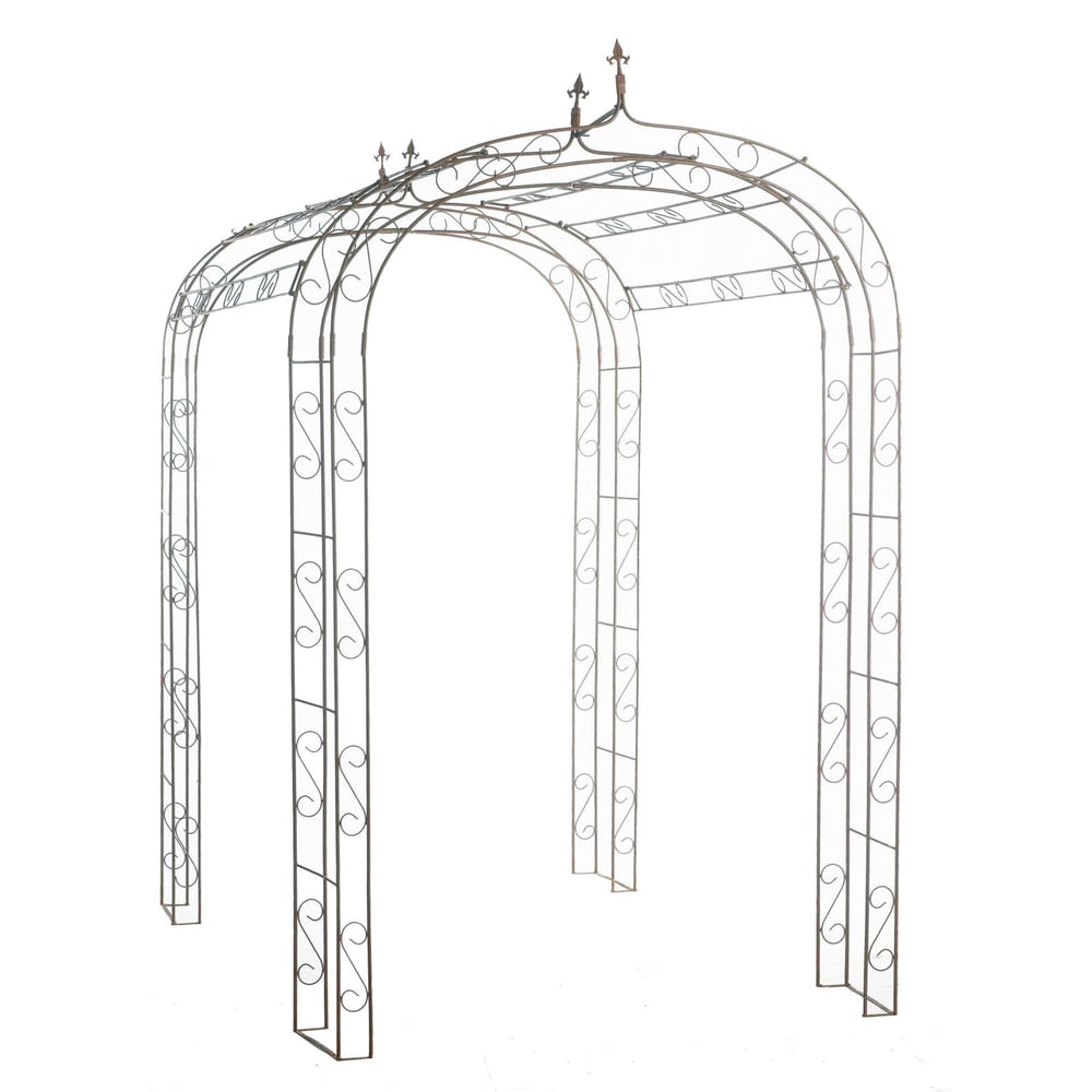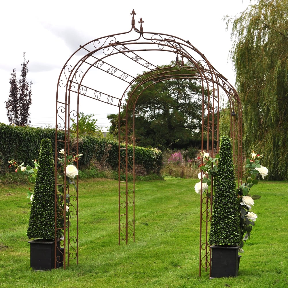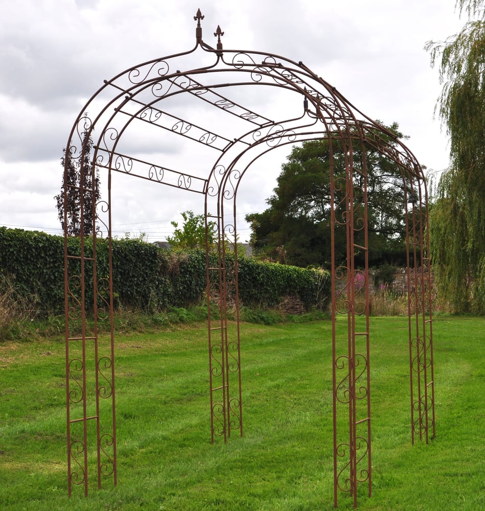 French-inspired rusted iron garden tunnel with Fleur-De-Lys detailing, 240cm long