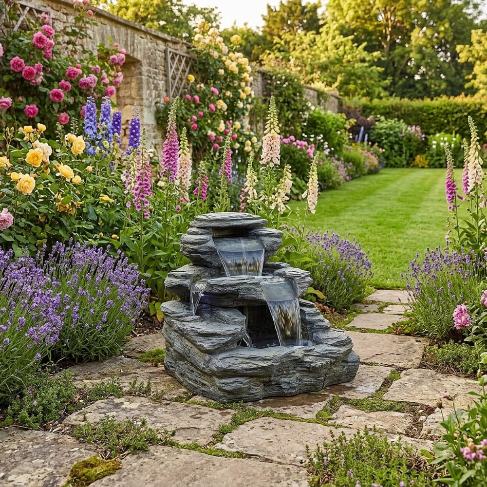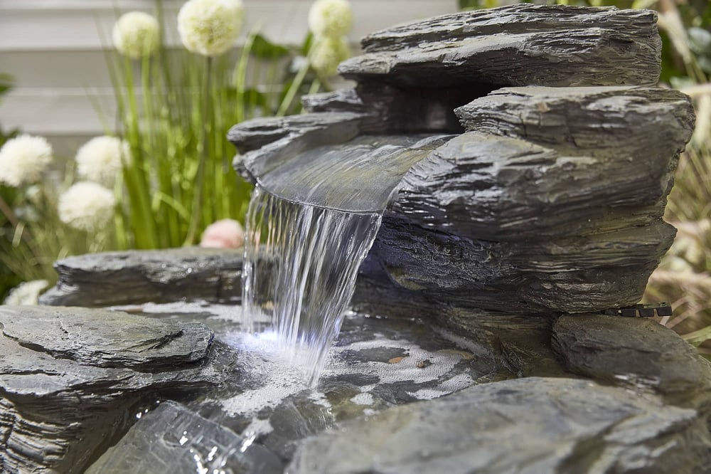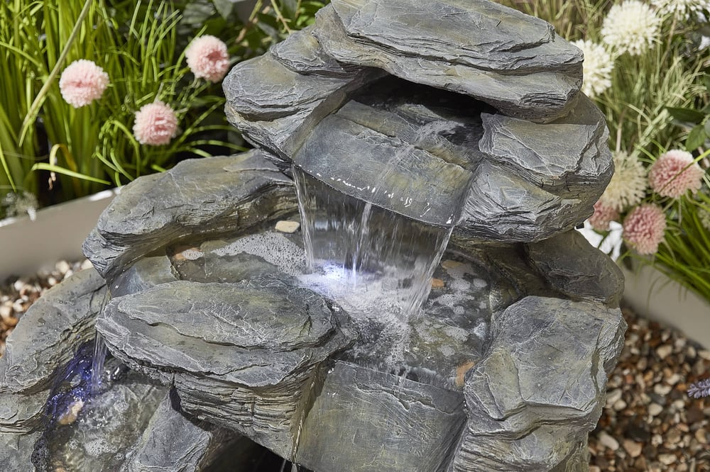 Cascading slate-effect water feature with LED lighting, crafted from GRC and ready to enjoy in minutes