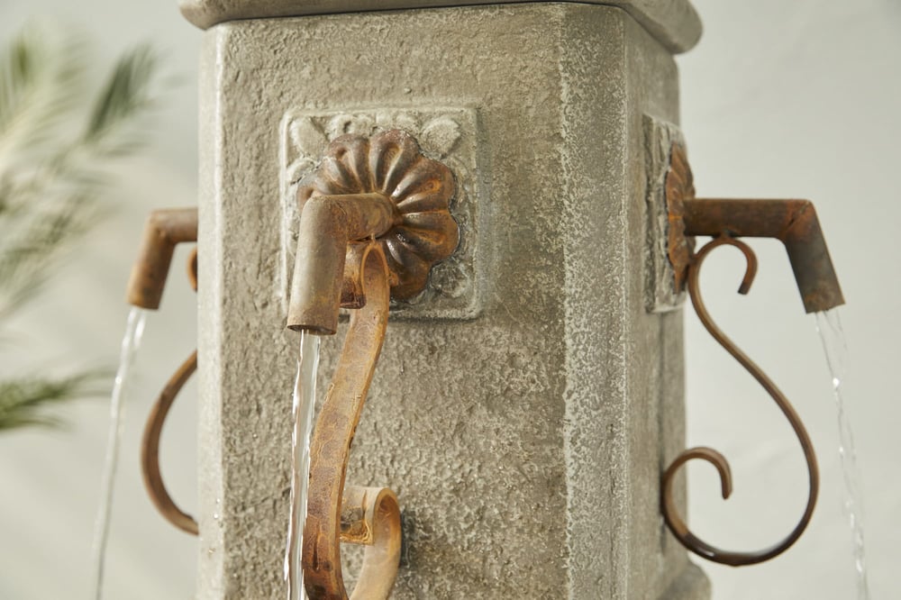 The Piazza Self Contained Water Feature brings old-world charm to any garden or patio. Standing 133cm tall, it features four copper-effect taps that cascade water into a floral-shaped basin below.