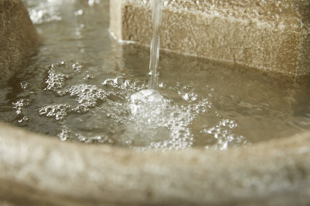 The self-contained design means no plumbing or external water supply. Water recirculates through the four taps and back into the basin. Top up occasionally in warm weather to replace what evaporates.
