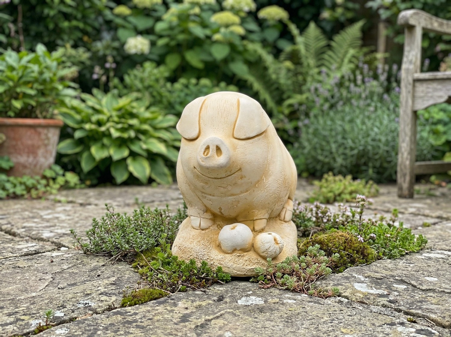 The Pig with Apples Garden Ornament in Sandstone stands 25cm tall. It weighs 3.6kg, giving it a solid, settled feel wherever you place it. The warm sandstone colouring draws from natural Cotswold tones. It blends well against borders, patios, and cottage garden planting.