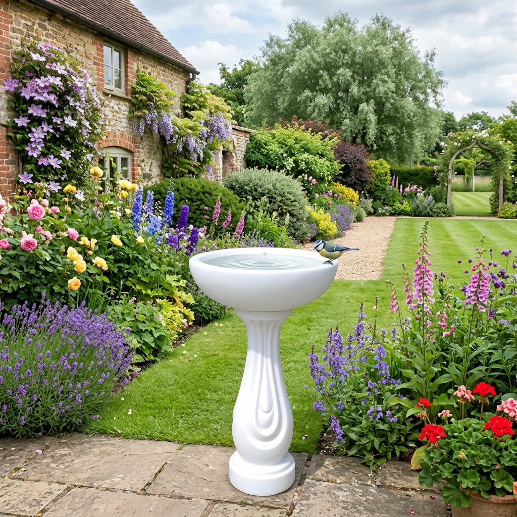 The Ripple Bird Bath in White stands 70cm tall and gives garden birds a clean, safe place to drink and bathe all year round.