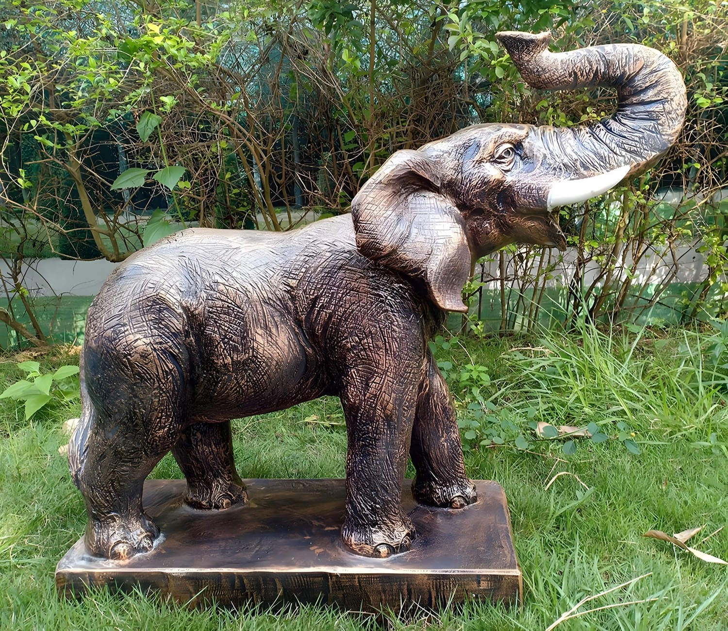 Hand-finished, this piece is cast from a premium fusion of crushed marble and resin to achieve a dense, stone-like quality with a lustrous bronze sheen. The Roaring Elephant Garden Statue in Bronze features an uplifted trunk and detailed ear texturing, as seen in the provided imagery, and is fully frost-resistant to ensure it maintains its magnificent, gallery-grade appearance through the changing seasons with minimal maintenance.