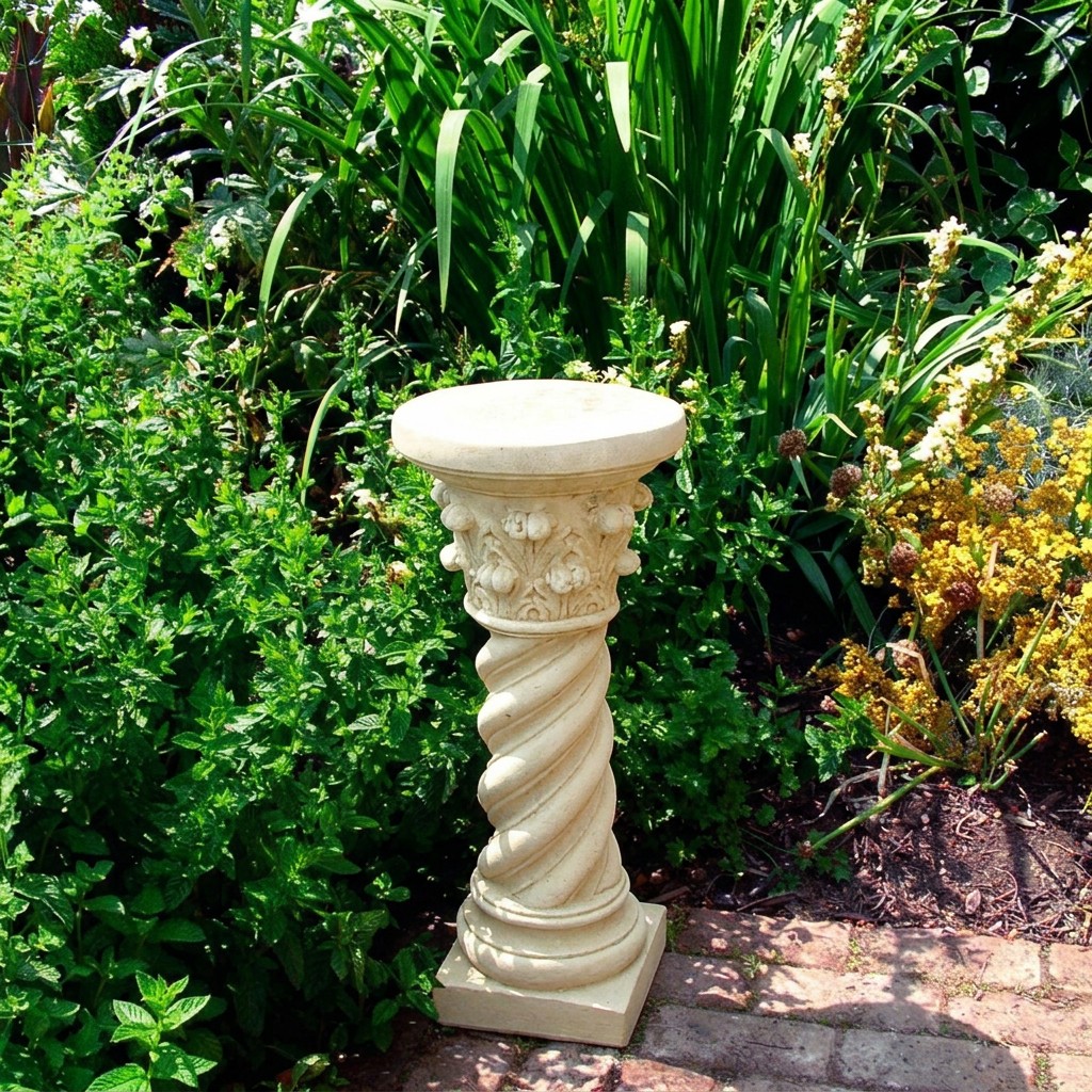 The Roman Column Garden Pedestal stands 680mm tall with a twisted shaft and classical fruit motifs carved into cast stone.