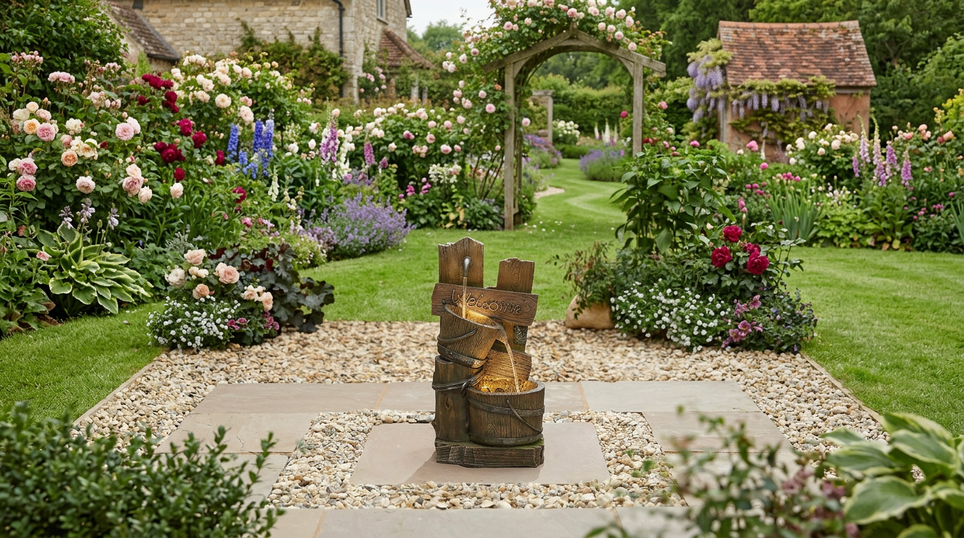 Countryside charm with flowing water and LED lights in a weatherproof 52cm poly resin feature