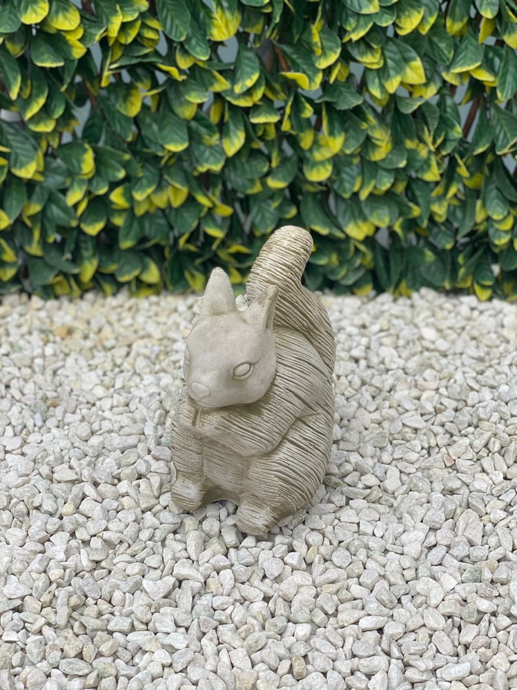 A 42cm hand-finished cast stone squirrel ornament with frost-proof construction and natural weathering finish