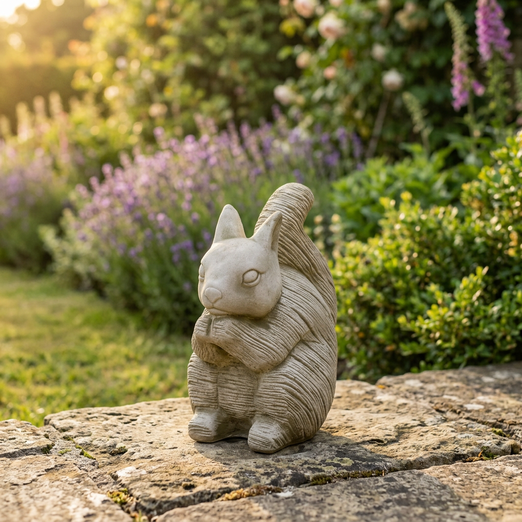 Cast from a durable stone compound, the Rustic Squirrel Garden Ornament arrives with textured, hand-finished detailing. The carved fur and bushy tail give it a lifelike quality. At 5kg, it holds its position on gravel paths, patio edges, or tucked into a flower border. The frost-proof construction means it stays outdoors through every British winter without cracking or flaking.