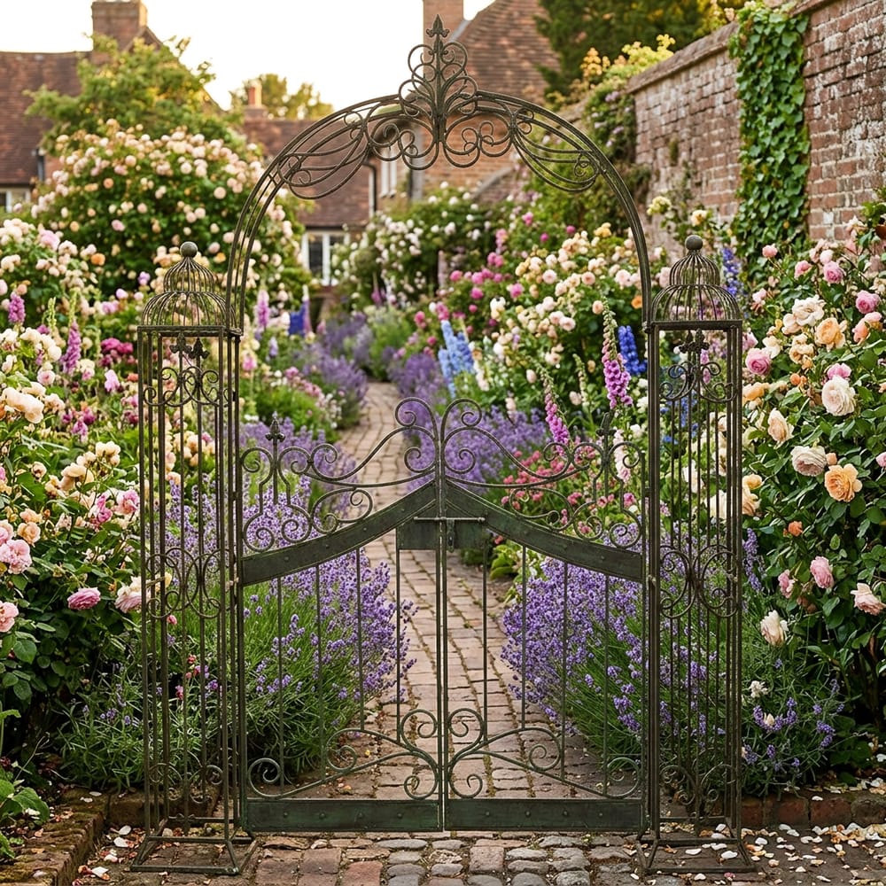 Ornate scrollwork detailing runs across the arch top and gate panels. The traditional styling suits cottage gardens, period properties, and formal borders alike. Train climbing roses or clematis over the frame to soften the lines as the seasons pass.
