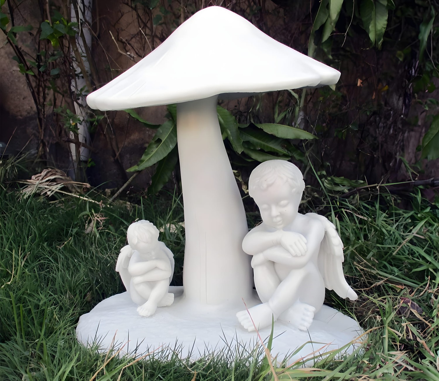Hand-refined to achieve a gallery-grade finish, this Sheltering Cherubs Garden Statue depicts two small, contemplative cherubs taking refuge beneath the protective cap of a large, textured toadstool. Cast from a specialised marble-resin fusion that provides the substantial weight and cooling touch of natural stone, the piece is entirely frost-resistant to ensure the delicate facial details and feathered wings remain protected through the harshest British winters.