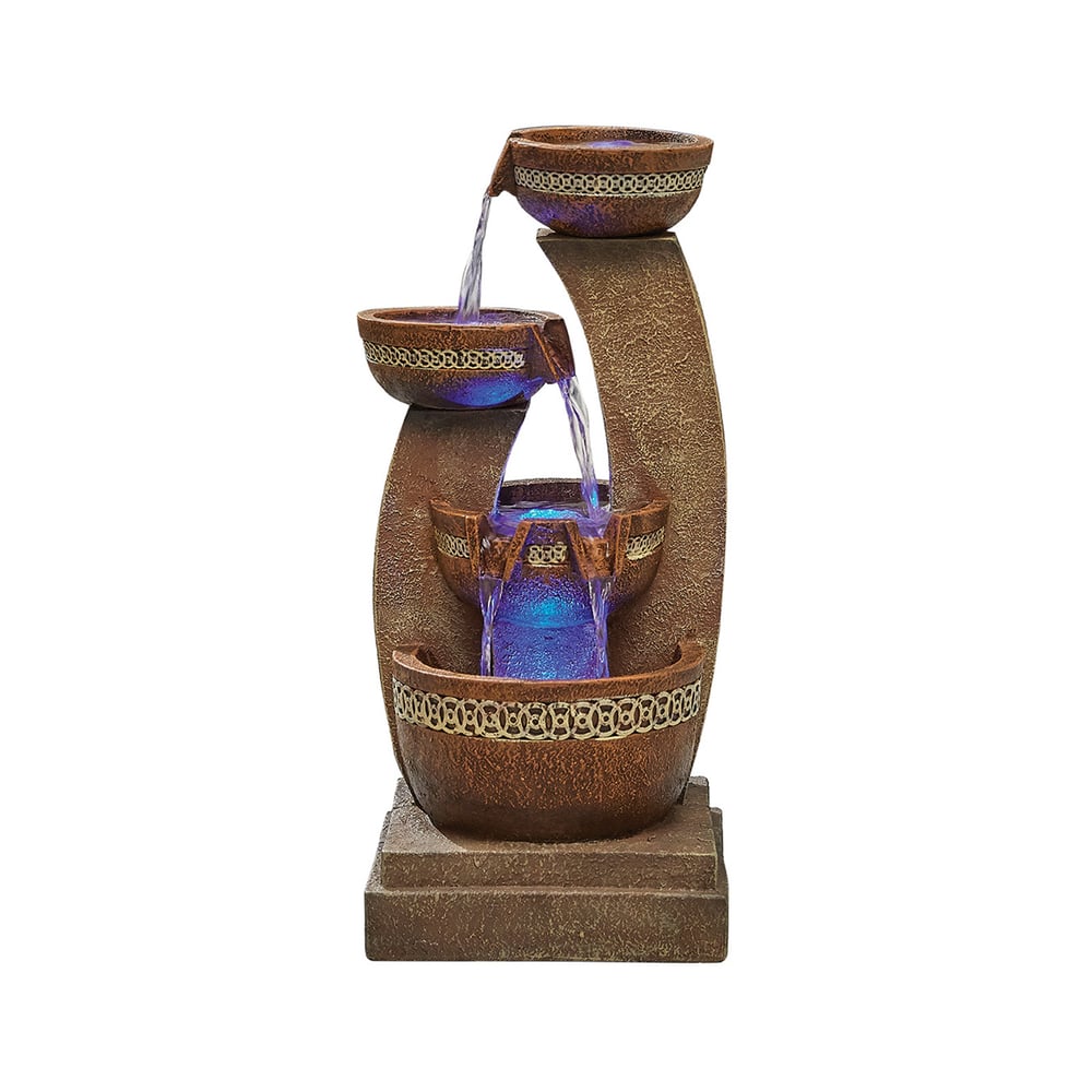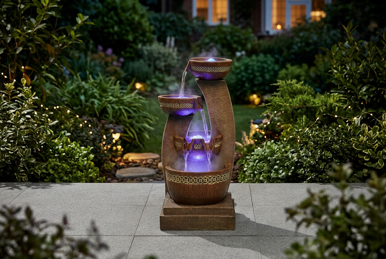 At night, the built-in low-voltage LED lights illuminate the four cascading pools, casting a serene blue glow that transforms the atmosphere. The soothing sound of bubbling water adds to the tranquil ambiance, making it perfect for relaxation. Whether used as a centerpiece in a garden or as a subtle enhancement to a patio, the Azure Column water feature combines functionality with elegance, providing a charming focal point for any outdoor setting.