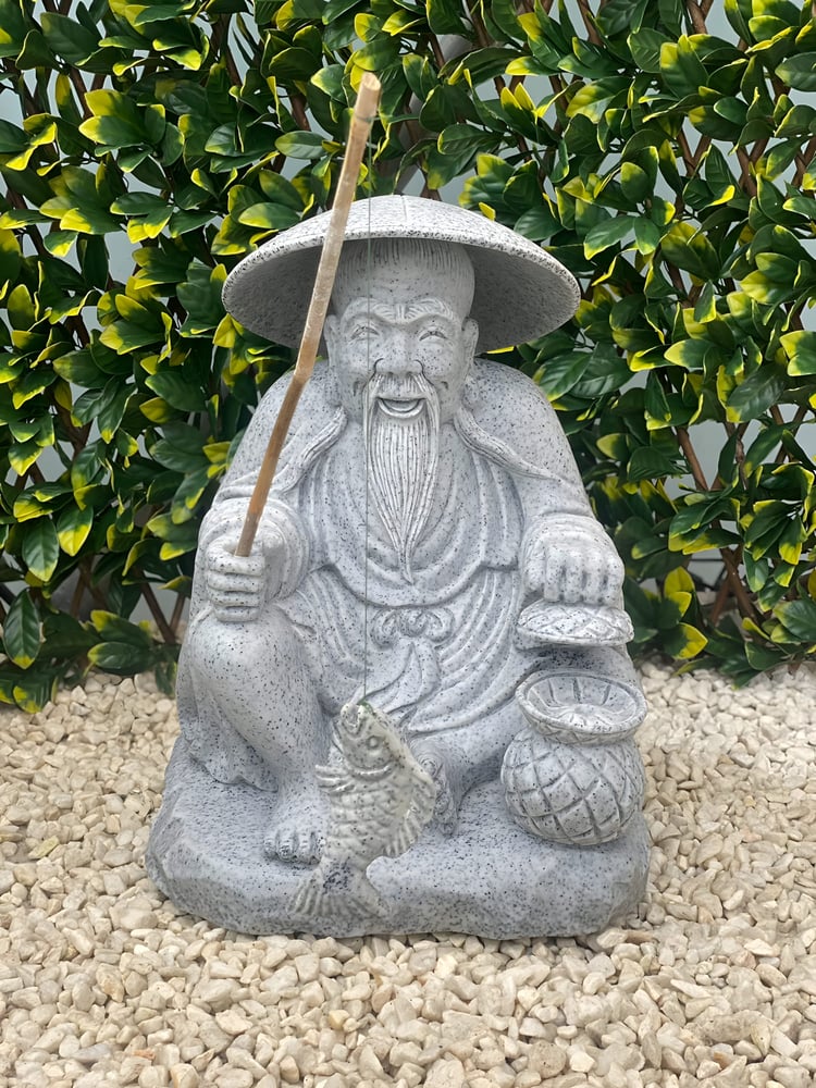 The Sitting Fisherman is modelled on classical Chinese sculpture. The figure sits cross-legged, holding a bamboo rod in one hand and a freshly caught fish in the other. A wide-brimmed hat and flowing robes add fine sculptural detail. Every crease and fold is reproduced from the original mould.