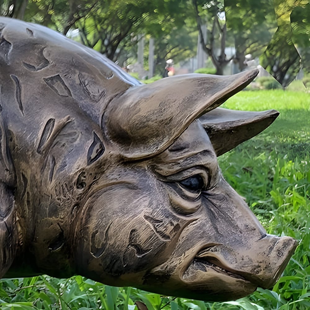 Hand-finished, this Sitting Pig Garden Statue in Bronze is cast from a high-quality blend of crushed marble and resin to achieve a dense, stone-like feel with a radiant bronze sheen. Its frost-resistant build ensures the ornament remains a durable, year-round outdoor feature, requiring only a simple wash with soapy water to maintain its detailed, high-quality appearance regardless of the weather.