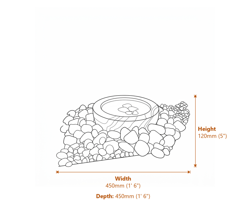 At just 450mm across, this babbling bowl fits neatly on a patio, beside a bench, or tucked into a planted border. The soothing water sound masks background noise and attracts birds. It works well as a standalone feature or grouped with other sandstone pieces.