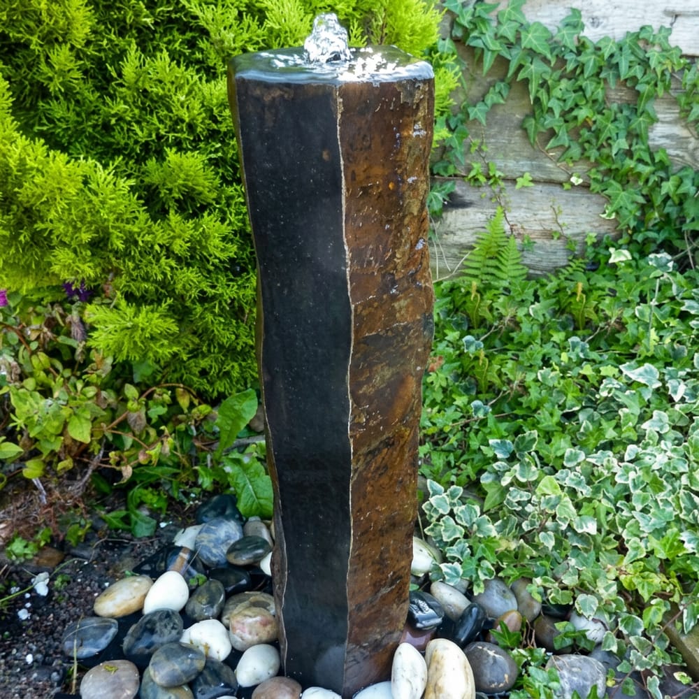 The dark charcoal-grey basalt works well alongside gravel, slate chippings, or green planting. Position it as a focal point near seating areas. The gentle sound of running water creates a calming atmosphere without overwhelming a small space.