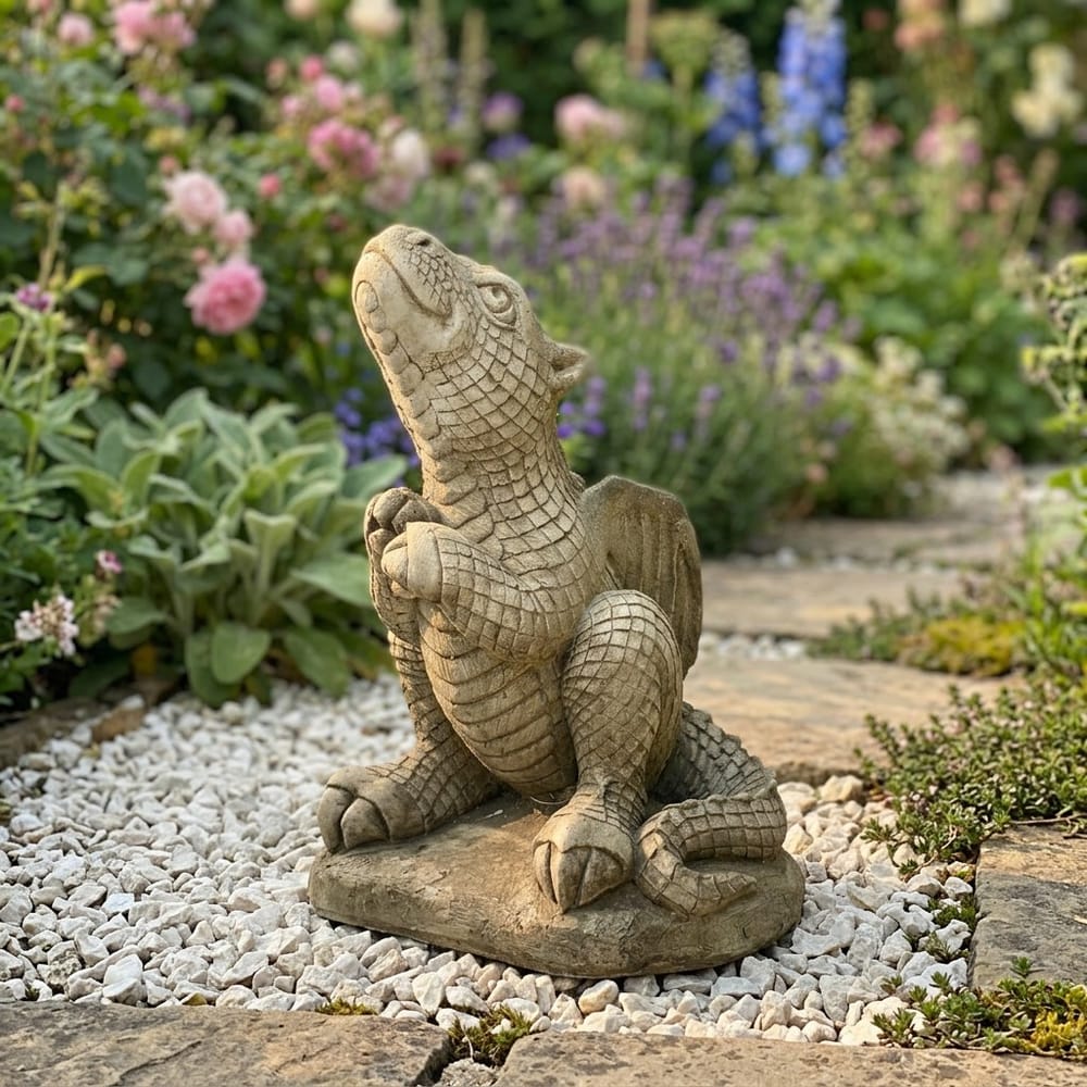 Each piece is hand-cast from reconstituted stone. The sculptors capture individual scales, clawed feet, and an upward gaze that gives real personality. At 210mm wide and 210mm deep, it fits neatly between plants or on a low wall.