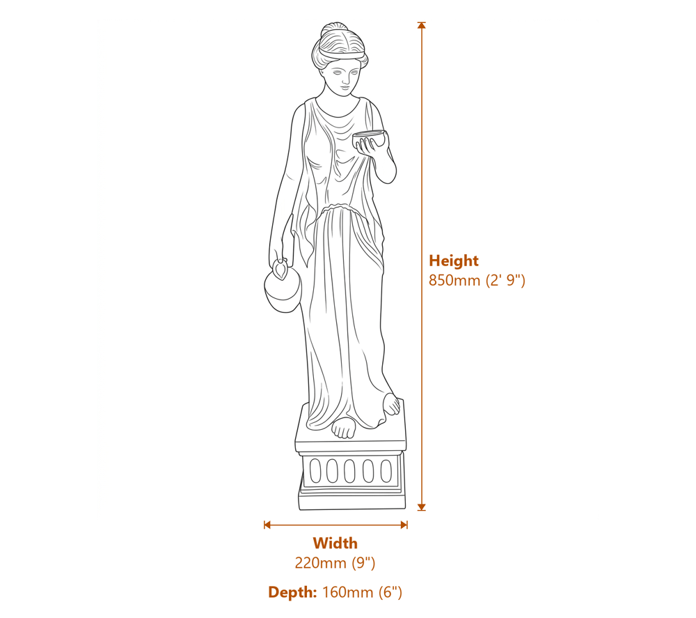 Guaranteed frost-proof, this Hebe statue holds its bronze lustre through harsh winters and hot summers alike. At 160mm deep and 220mm wide, it fits neatly on most garden plinths or shelving. Whether placed beside a pond, on a patio column, or in a hallway, this classical Greek sculpture makes a striking focal point.