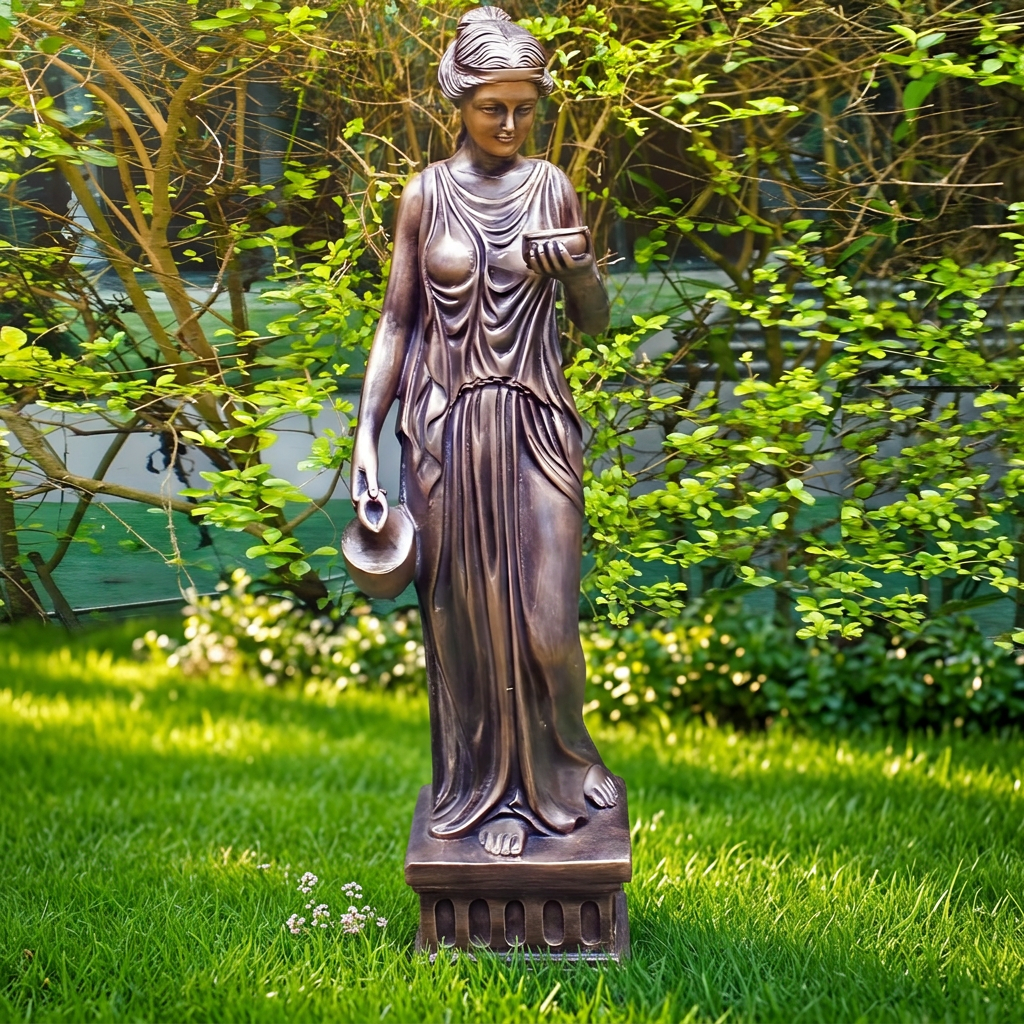 Hand-finished 85cm Hebe goddess statue in bronze alabaster, cast from crushed marble and resin, frost-proof for year-round display