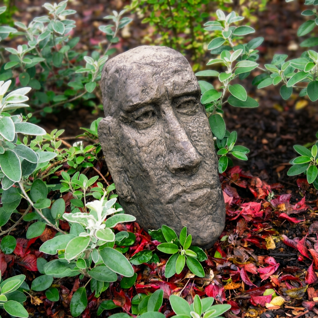 Each statue is hand-finished from cast stone by Lucas Stone here in the UK. The casting process captures fine facial detail â the brow line, nose, and lips are all clearly defined. Straight out of the box, the surface has an aged, weathered texture. Left outdoors, moss and lichen will naturally colonise the stone within a few months.