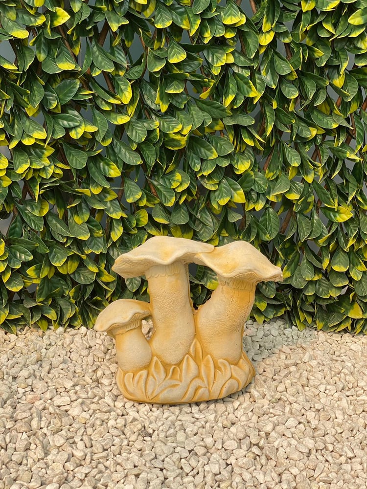 A hand-finished cast stone mushroom family ornament in sandstone, frost-proof for year-round garden display