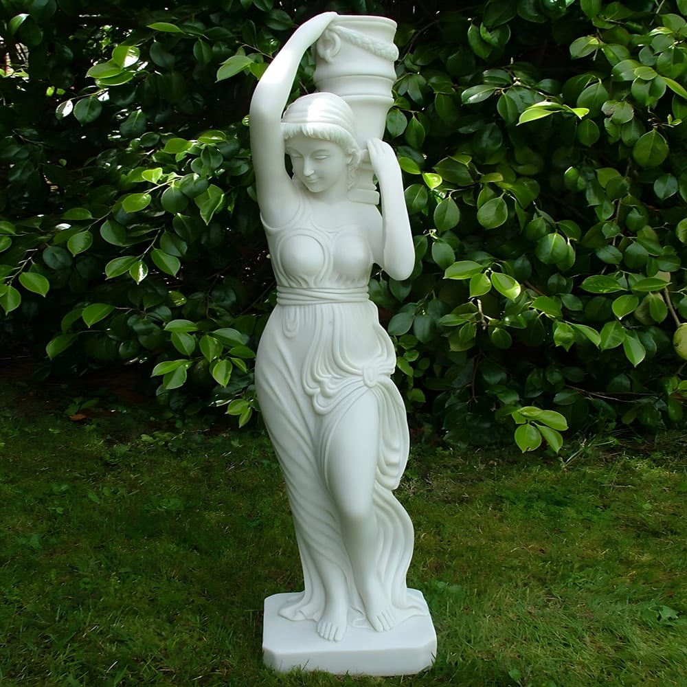 Expertly produced, this elegant ornament utilises a premium fusion of crushed marble and high-grade resin to achieve the smooth, radiant texture of authentic Italian alabaster. The Small Phoebe Garden Ornament is depicted in a balanced, graceful poseâas seen in the captured imageryâcarrying a classic vessel that adds to her timeless mythological appeal. Every piece is meticulously hand-refined to ensure a high-quality finish that stands as a captivating focal point for reflection and admiration. Built to brave the elements, its frost-resistant composition ensures it retains its pristine white appearance year-round, while the stable, flat-base design allows for effortless installation on garden patios, stone walkways, or decorative indoor plinths.