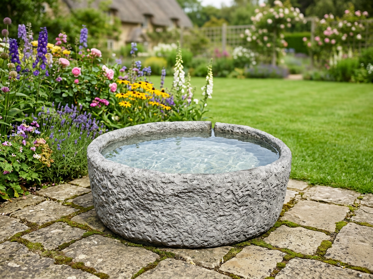 Each reservoir is handcrafted from cast stone using traditional moulding techniques. The casting process creates fine surface texture that encourages moss and lichen growth within weeks. This gives the piece an established, aged appearance from the start.
