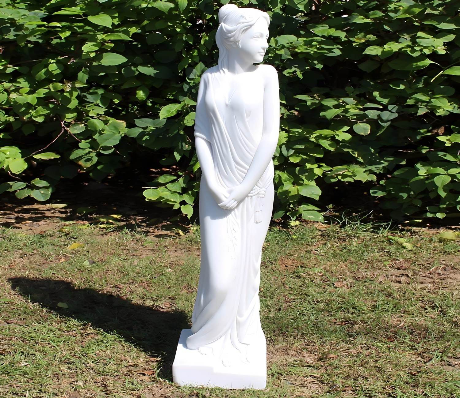 Hand finished, this elegant piece utilises a premium marble and resin fusion to achieve a smooth, brilliant white finish that captures the essence of refined alabaster. The Small Victoria Garden Ornament depicts a graceful figure in a contemplative, side-turned pose with hands clasped, providing an artistic focal point that is both frost-resistant and durable. Its integrated flat base ensures simple, stable installation on any level outdoor patio or interior floor.